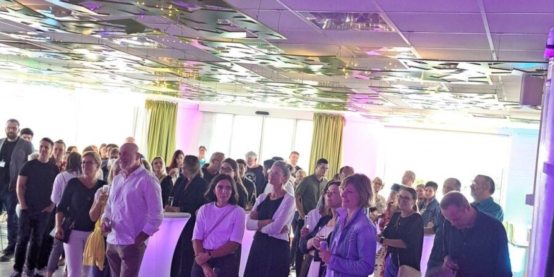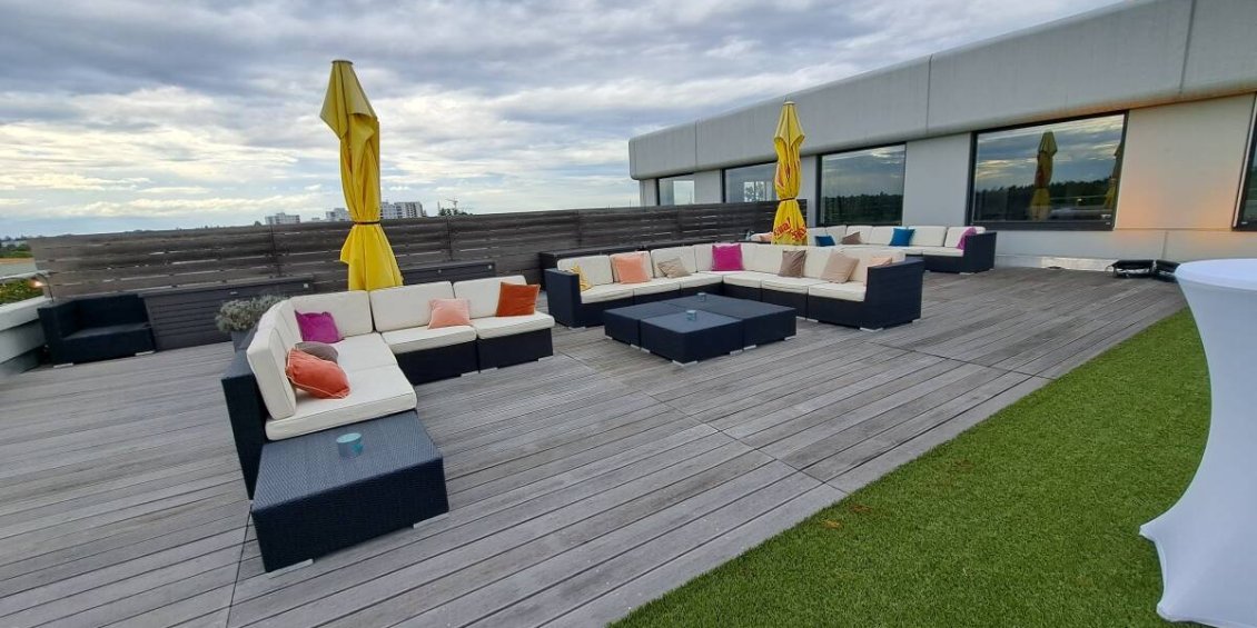 Um 17 Uhr ging's los im Heine-Casino, wo fast 200 Kolleg*innen aus Weiden und Karlsruhe zu unserer Rooftop-Party zusammenkamen. Die Vorfreude war riesig, und wir wurden nicht enttäuscht.